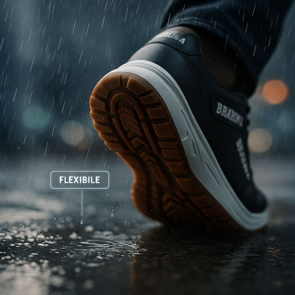 La suela con grip de goma adherente garantiza firmeza incluso en aceras mojadas o superficies lisas.